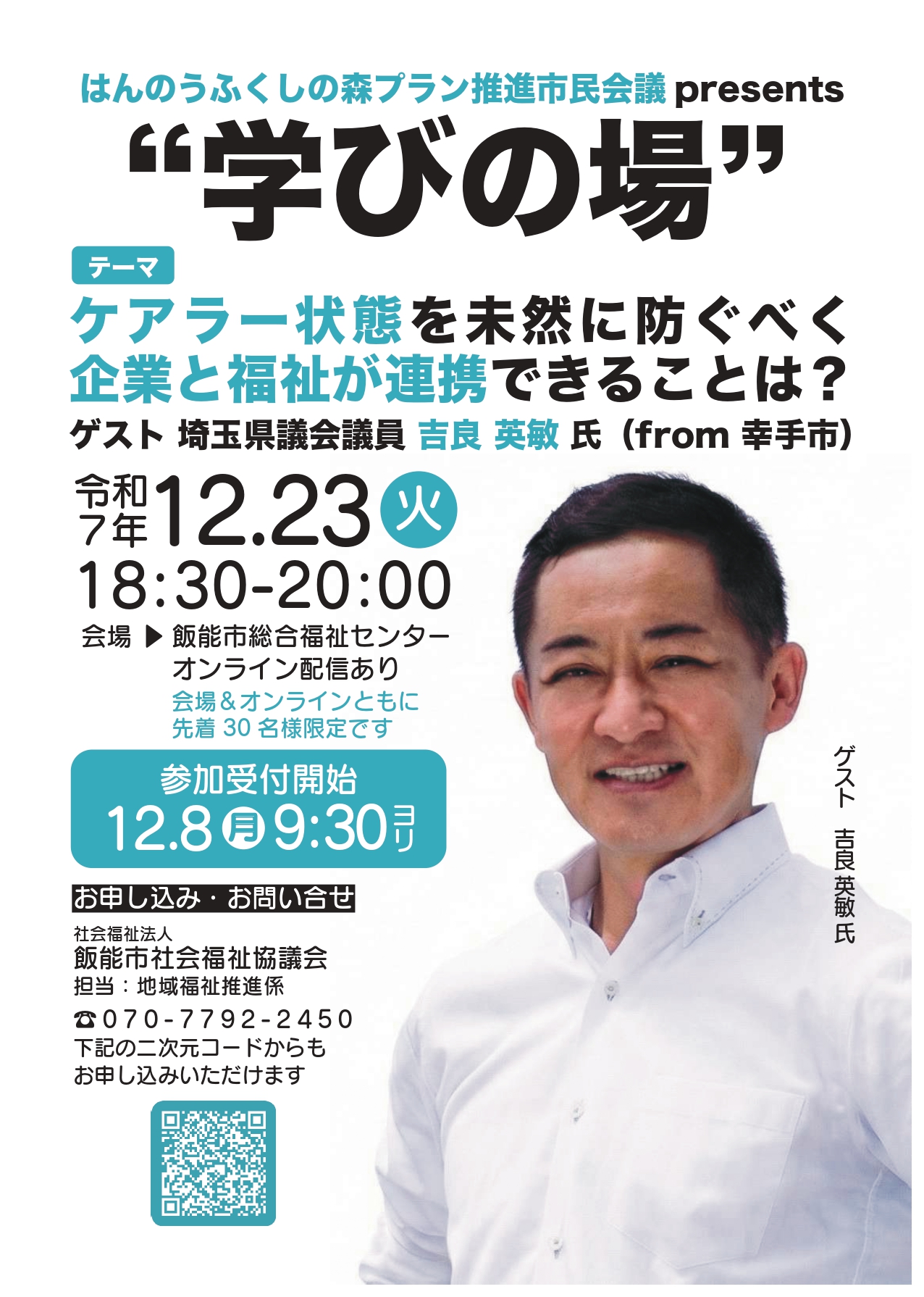 はんのうふくしの森プラン推進市民会議では、家族のケアを担う“ケアラー”の支援について、ゲストをお迎えして、ケアラー状態を未然に防ぐ地域での取り組み、企業との連携によるサポートなど、“今” 知っておきたい内容を一緒に学ぶ「学びの場」を開催します。ぜひ、ご参加ください!